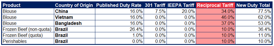 • The newly announced reciprocal tariffs are in additional to other duties and tariffs your products are subject to